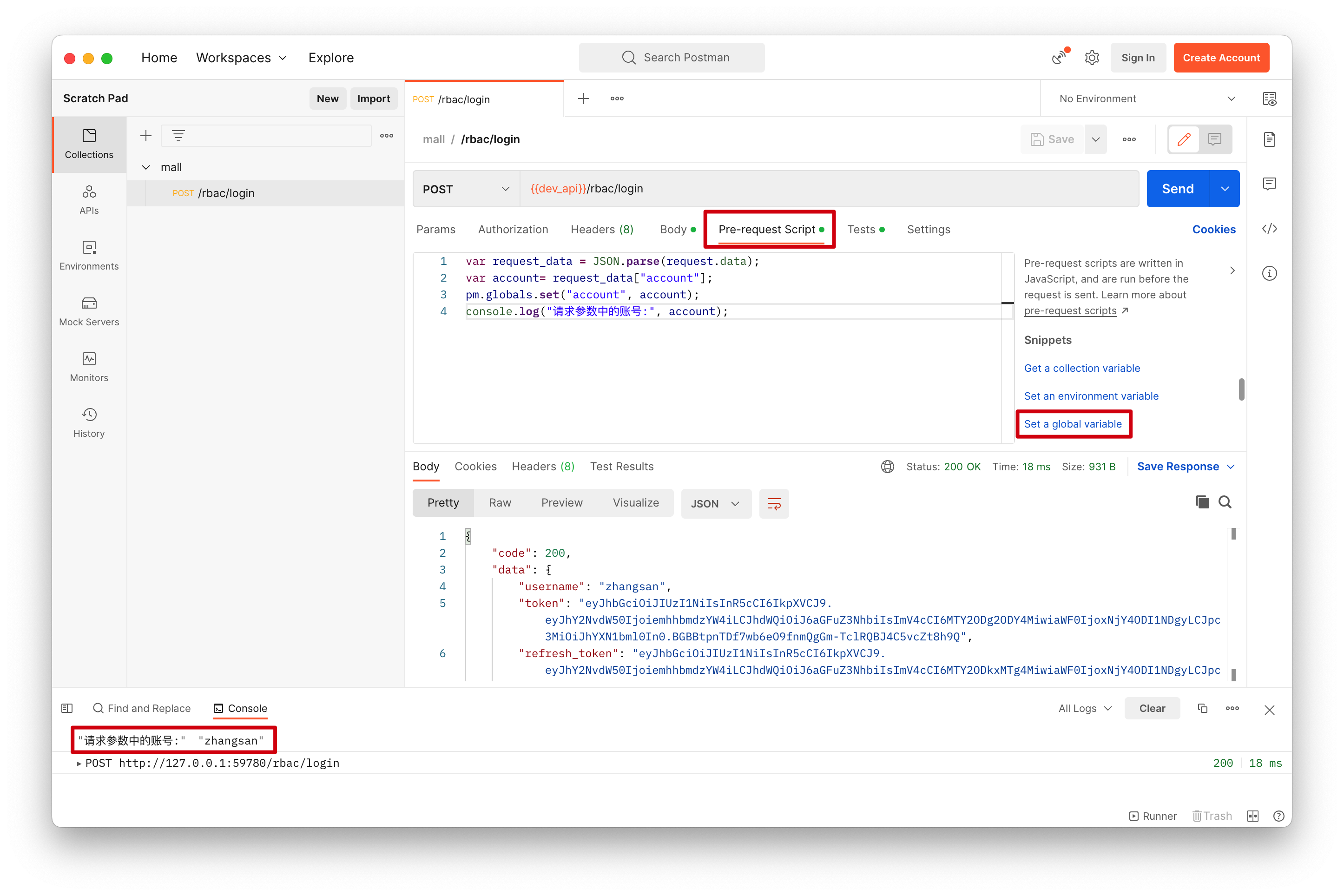 如果你想在请求发送之前获取请求体中的参数设置到环境变量中,需要切换Pre-request Script标签编写你的逻辑,如下图实例:获取请求体中的 account 设置到环境变量中。